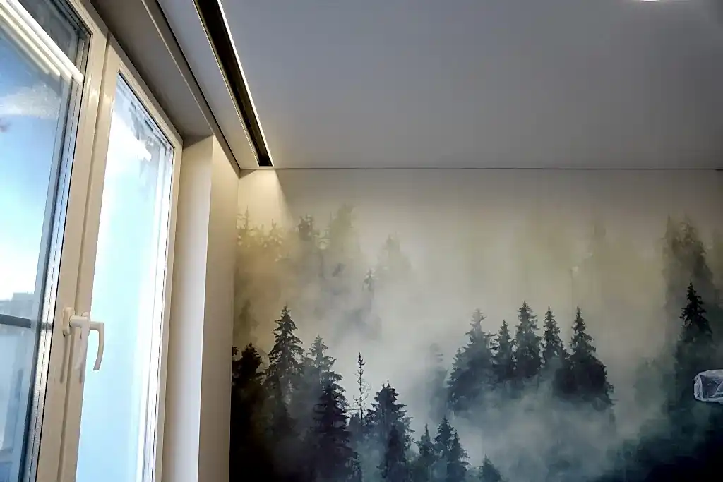 - Видом фактуры. Она может быть глянцевой, матовой, сатиновой. Если хотите больше глубины, эффект расширения пространства, выберите глянец. Для благородного блеска - сатин. Для более классического интерьера - матовую поверхность. Также доступны фактуры с имитацией дерева, бетона и других материалов.